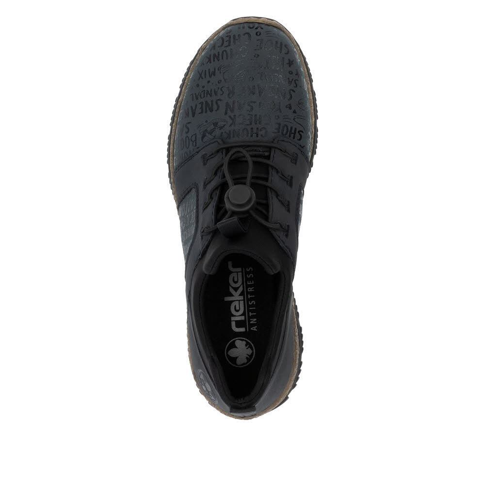 Wow-Faktor! Diese schwarzblauen Rieker Slipper für Damen punkten mit klassischem und sportivem Design. Der Schuh ist in der Anflechter-Machart gefertigt, was ihn besonders robust und flexibel macht. Die Gummischnürung ermöglicht ein leichtes An- und Ausziehen. Die schockabsorbierende und leichte Sohle sorgt für ein angenehmes Tragegefühl. Außerdem sorgt die extra weiche MemoSoft-Decksohle für eine Extraportion Tragekomfort. Achtung, Lieblingsschuh-Potential!
