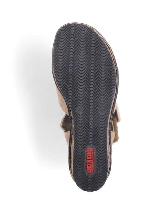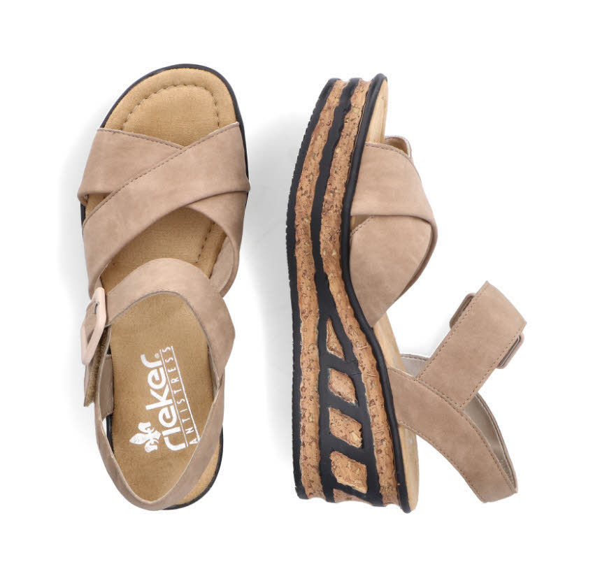 Maximaler Komfort auf Schritt und Tritt! Diese sandbeige Rieker Keilsandalette überzeugt durch modernes Design und hohen Tragekomfort. Perfekter Halt und eine optimale Passform sind durch überkreuzte Riemen, einen Klettverschluss und einen Fersenriemen garantiert. Die schwarzen Linien an der Sohle runden das moderne Design perfekt ab. Die Sohle mit Keilabsatz ist sowohl leicht als auch schockabsorbierend und bietet damit ein doppeltes Wohlgefühl bei jedem Schritt. Gesucht, gefunden!