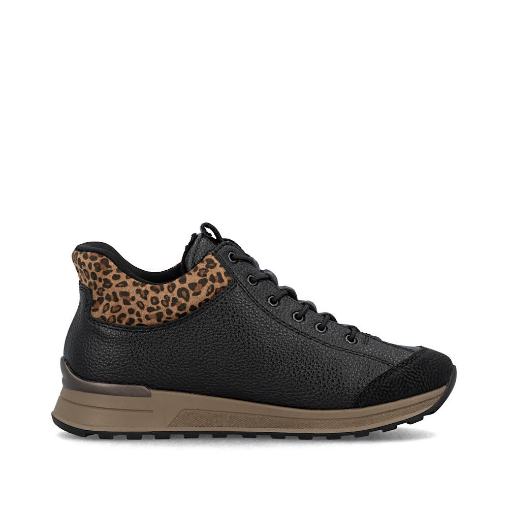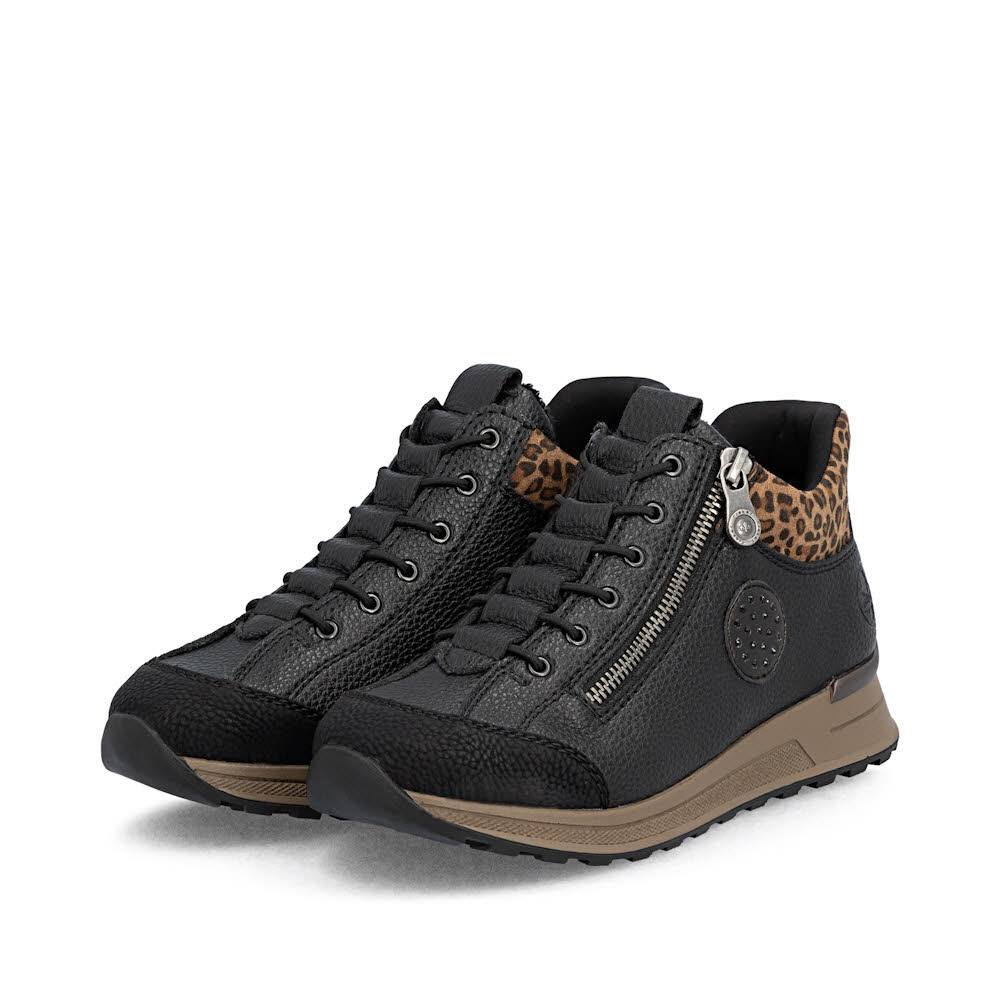 Style Vibes are on! Dieser schwarze Rieker Kurzstiefel für Damen überzeugt durch modernes Design und hohen Tragekomfort. Für ein bequemes An- und Ausziehen sorgt der Reißverschluss. Ein wahrer Eyecatcher ist der Leo-Print. Die schockabsorbierende und leichte Sohle bietet anhaltendes Wohlgefühl ‒ auch an langen Tagen. Der Schuh verfügt über eine gepolsterte und herausnehmbare Einlegesohle, die ein bestechendes Komfort-Feature ist. Durch die Extraweite ist den Zehen mehr Bewegungsfreiheit geboten. Ready2GO: Einfach hineinschlüpfen, ganz ohne Hände und Knickspuren - durch das harte Fersenteil bleibt der Schuh in Form! Einfach hineinschlüpfen und los!
