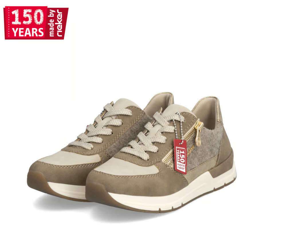 Wir lieben Beige! Diese braunbeigen Rieker Sneaker Low für Damen sehen nicht nur stylisch aus, sondern sorgen dank ihrer Qualität auch für den gewissen Komfort im Alltag - und das Beste: Sie sind eines unserer exklusiven "150 Years Made by Rieker" Modelle! Eine Schnürung ergänzt den Reißverschluss und sorgt für Funktionalität und Komfort. Das goldene Detail verleiht dem Schuh das gewisse Etwas. Mit der griffigen Sohle ist trittsicheres Gehen eine Selbstverständlichkeit. Die Sneaker Low punkten zusätzlich mit einer gepolsterten und herausnehmbaren Einlegesohle. Wohlge(h)fühl inklusive!