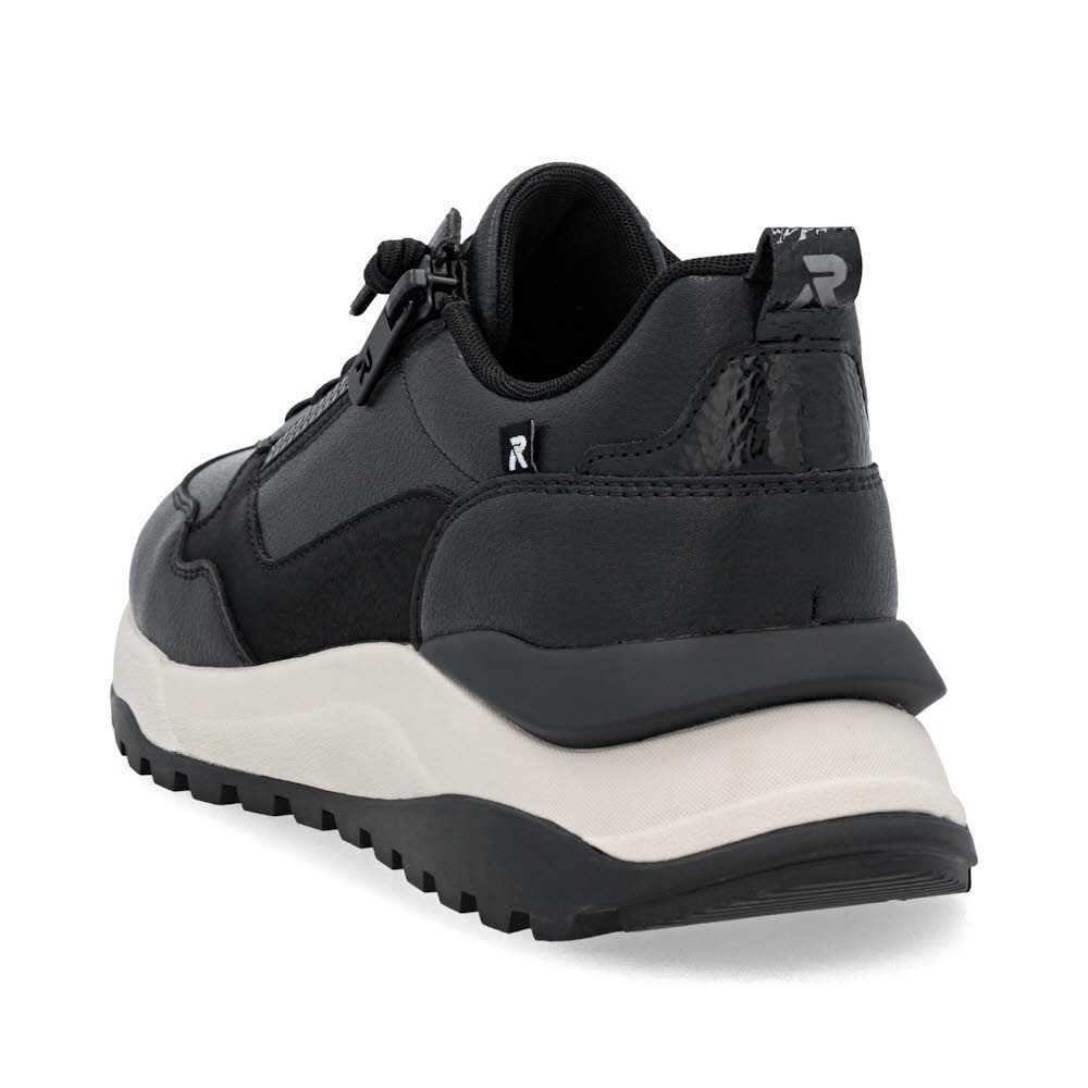 Aus hochwertigem Glattleder gefertigte schwarze Rieker Sneaker Low für Damen. Die Schnürung wird durch einen praktischen Reißverschluss ergänzt. EVA-Laufsohle mit ultraleichter und flexibler Eigenschaft. Die Einlegesohle ist herausnehmbar, gepolstert und dämpfend. Leichter Microvelour-Drysport-Futtermix mit atmungsaktiver Eigenschaft.