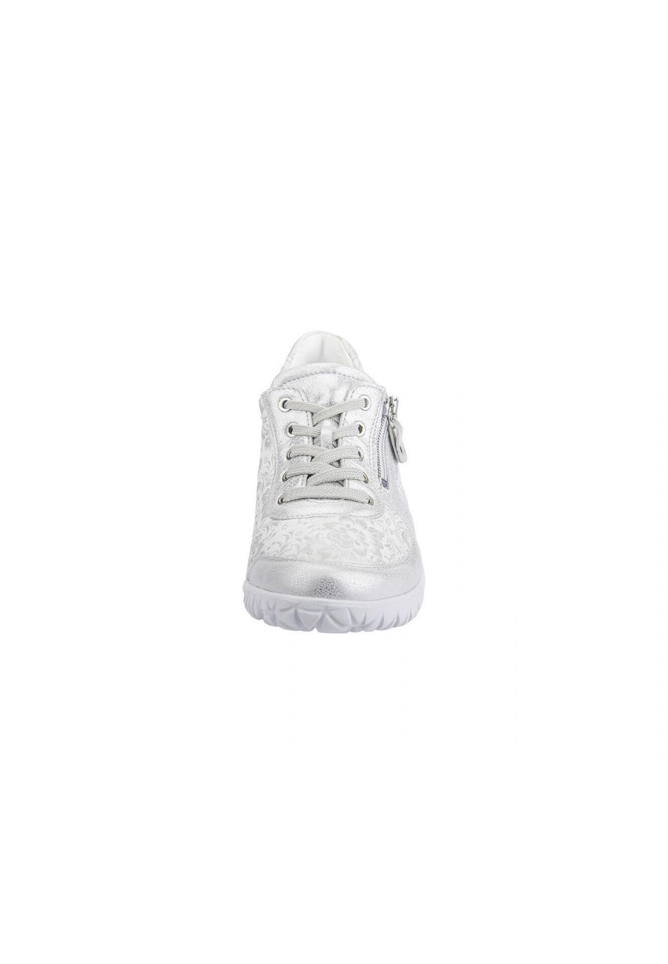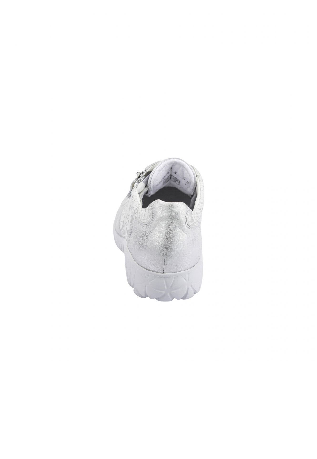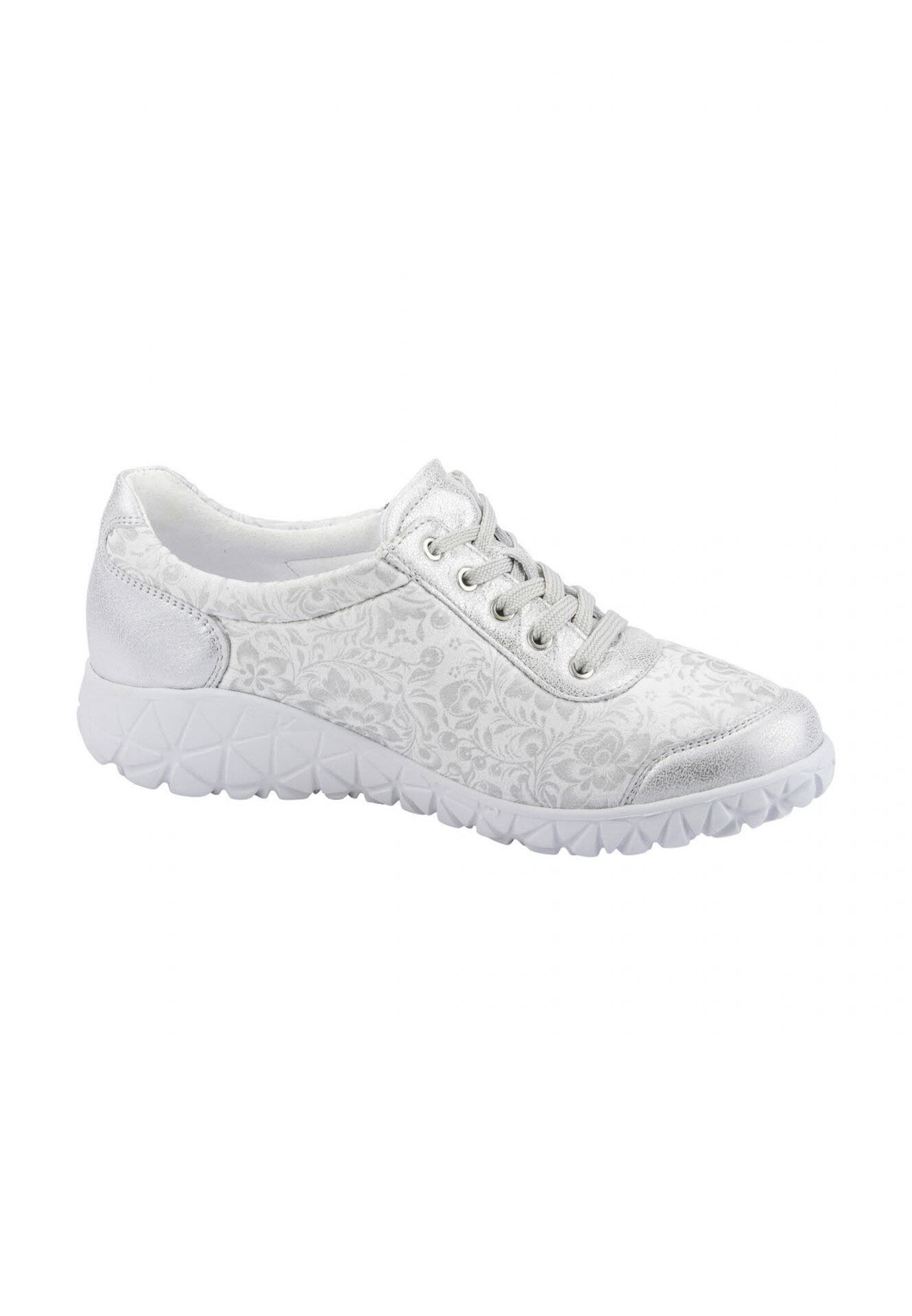 Ein Waldläufer wie Havy-Soft kann beides sein: Orthotritt Komfortschuh und Fashion Statement in einem. Entscheidend dafür ist die Wahl der Materialien in hoch dehnbarer Qualität: Nubuk und Textilstretch in Weiß und Silber mit floralem Print und stylischem Metallic-Effekt. Auch darüber hinaus bringt der Schnürer alles mit, was ein Komfortschuh braucht: von der Bequemweite H über den seitlichen Zipper zum einfachen Ein- und Aussteigen bis zum atmungsaktiven und antibakteriell ausgestatteten Wechselfußbett und der stylischen Laufsohle aus extraleichtem EVA-Material.