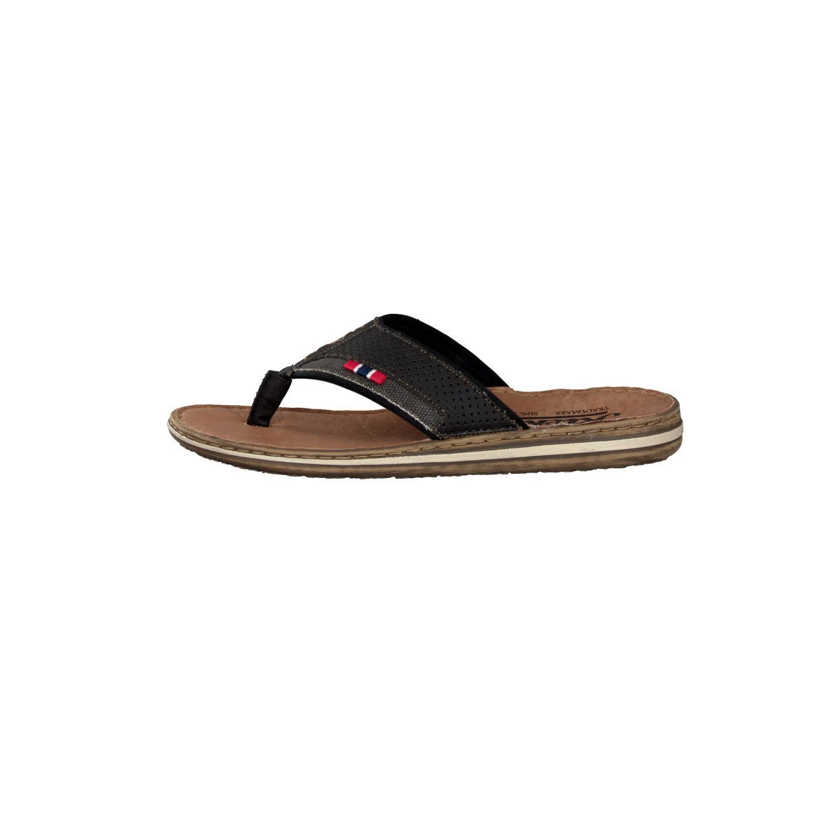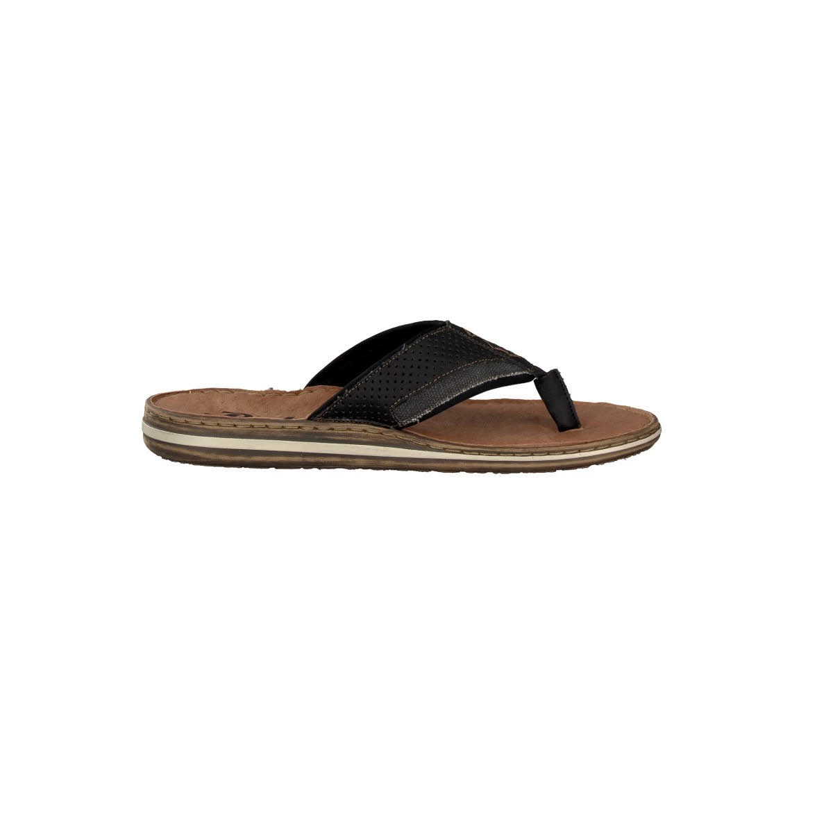 Die schwarze Zehensteg-Pantolette aus einem schönen Mix aus perforiertem Lederimitat und robustem Textil ist mit modischen beigefarbenen Ziernähten versehen. Innenseitig sorgt ein ultra-softes Synthetikmaterial dafür, dass der Fuß vor Druckstellen optimal geschützt ist. Eine gepolsterte Leder-Innensohle und eine Sandwichsohle in Braun und Cremeweiß vervollständigen den absoluten Tragekomfort dieser Freizeit-Pantolette.