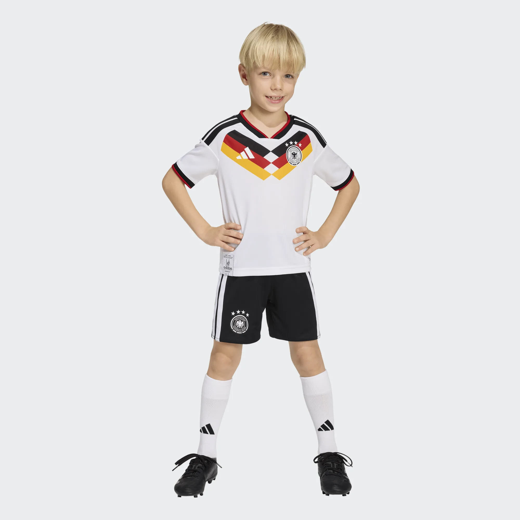 Beim Fußball zählt jedes Detail. Das Set Germany 26 Home wurde entwickelt, um junge Fans zu begeistern. Dieses Set ist eine Hommage an das Erbe des deutschen Fußballs und zeigt klassische Trikot-Elemente aus legendären Momenten, die für die Zukunft neu interpretiert wurden. Die integrierten Climacool und Aeroready Materialtechnologien leiten den Schweiß ab und sorgen für ein kühles, trockenes und ablenkungsfreies Tragegefühl, damit du dich frisch und bequem fühlst, ganz gleich, ob du auf dem Spielfeld aktiv bist oder von der Tribüne aus jubelst. Mit seiner regulären Passform bietet dieses Set hohen Tragekomfort und volle Bewegungsfreiheit - eine gute Wahl für aktive Kinder. Der zusätzliche Schriftzug mit Flagge verleiht die nötige Authentizität und macht dieses Set zu einem absoluten Must-have für junge Fußballfans. Mit diesem Set kann dein Kind selbstbewusst und stilvoll in die Welt des Fußballs eintauchen. Bei adidas geht es um mehr als nur um Kleidung. Die Marke ist ein Symbol für Leidenschaft und Stolz.