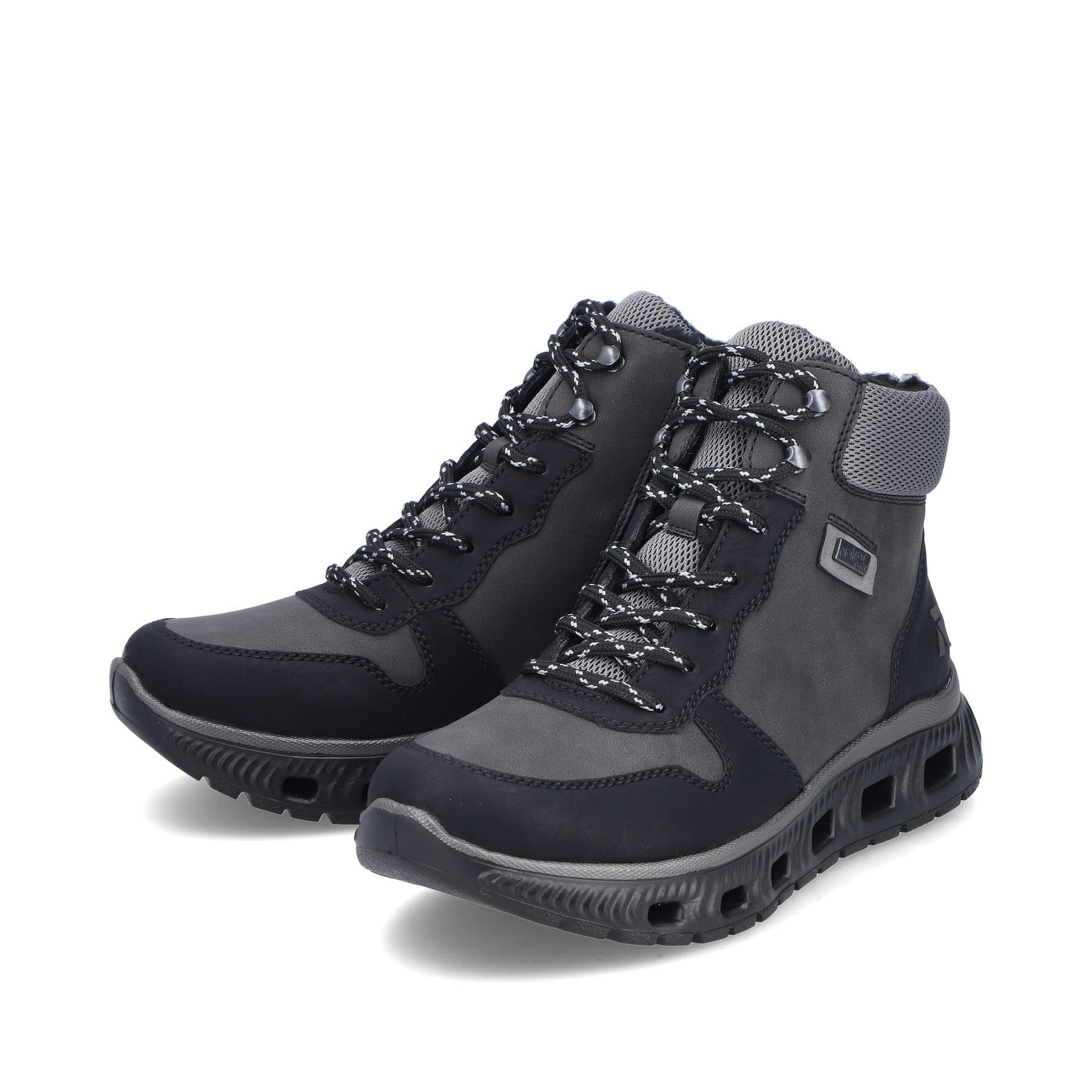 Sportiv und modern. Diese grauschwarzen Rieker Sneaker High für Damen bringen alles unter einen Hut: Komfort, Funktion und natürlich Style. Die clevere Kombination aus Schnürung und Reißverschluss ermöglicht ein einfaches An- und Ausziehen. Die silberfarbenen Ösen verleihen dem Schuh das gewisse Etwas. Die schockabsorbierende und ultraleichte Sohle bietet anhaltendes Wohlgefühl ‒ auch an langen Tagen. Ein weiteres Plus ist die extra weiche MemoSoft-Decksohle. Dank der Komfortweite ist genügend Platz im Vorfußbereich geboten. Ein kuscheliges Warmfutter und die bewährte RiekerTEX-Technologie machen diese Sneaker zum optimalen Begleiter bei jedem Wetter. Da steht langen Spaziergängen nichts mehr im Weg!