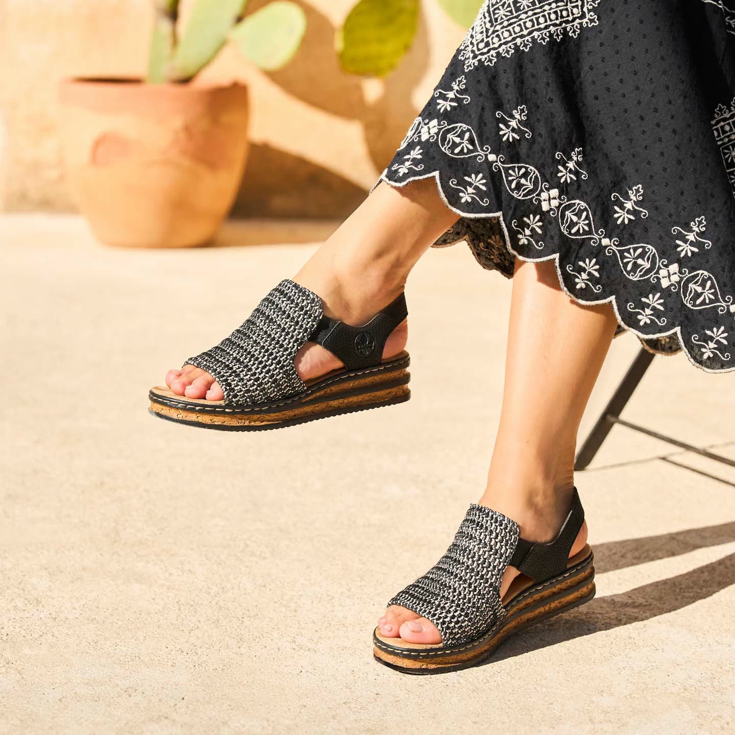 Auf dem Fashion-Radar! Diese schwarzen Rieker Keilsandaletten überzeugen mit echtem Komfort für die Füße. Durch die Anflechter-Machart ist der Schuh robust und die Sohle besonders biegsam, ohne dass Beschädigungen am Übergang zum Schaft entstehen. Der Gummizug macht das An- und Ausziehen einfach und bequem. Die leichte und schockabsorbierende Sohle mit Keilabsatz bietet besten Laufkomfort und die Decksohle ist extra weich. Die schmale Passform E 1/2 bietet dem Fuß zusätzlichen Halt im Schuh. Deine Best-Buddies für die neue Saison!