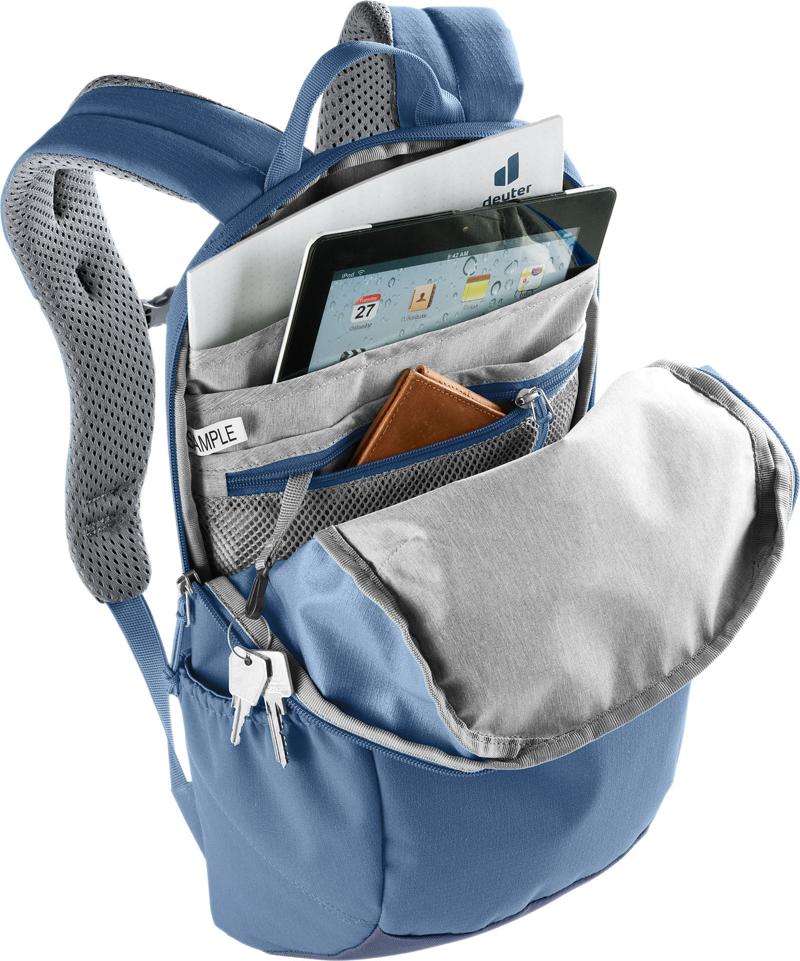 Stufenlos verstellbarer Brustgurt Innenfach zur sicheren Unterbringung von Wertgegenständen Elastische Seitentaschen Dokumentenfach Tasche für Tablet Seitliches Handyfach Ergonomisch gepolsterte Schulterträger Schlüsselclip Tragegriff Airstripes System bluesign® product Grüner Knopf zertifiziertes Produkt klimaneutrales Produkt Stoff aus 100% recyceltem PET PFC frei Angaben zum Hersteller (EU-Produktsicherheitsverordnung, GPSR) Deuter Sport GmbH Daimlerstr. 23 86368 Gersthofen Deutschland info@deuter.com