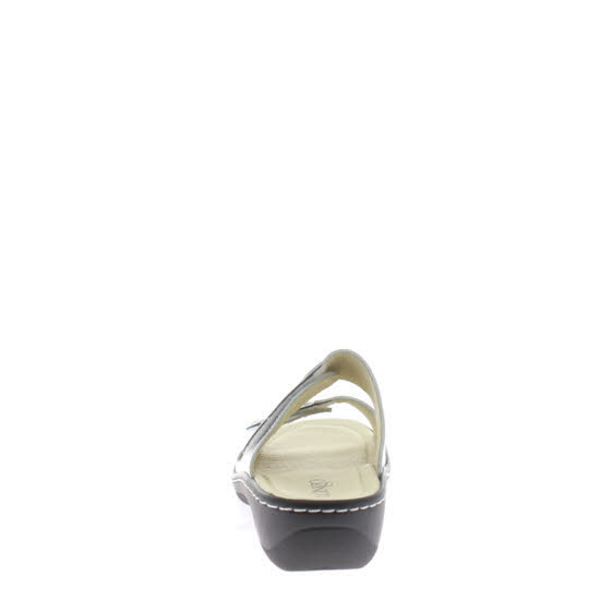 Bequeme Fußbett-Pantolette von Longo in weiß bronce kombiniert aus Leder auf Keilabsatz, Innenfutter aus Leder, wechselbares Fußbett, gute Paßform durch zwei verstellbare Klettverschlüsse, Sohle aus Gummi.