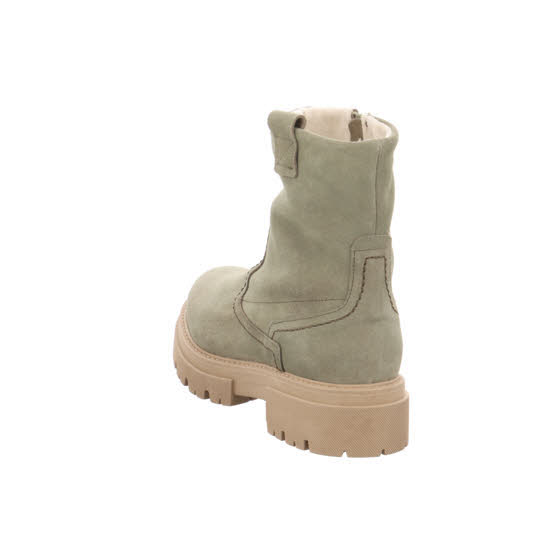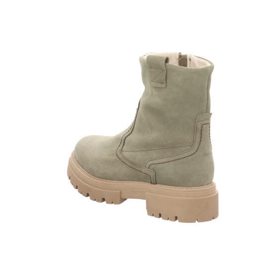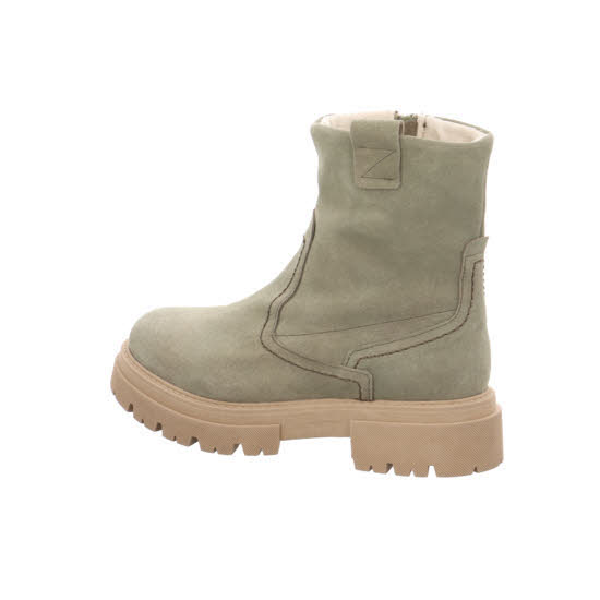 Khaki-farbene Kurzstiefelette in Veloursleder für Damen. Ein komfortabler Begleiter mit halbhohem Schaft. Durch den seitlichen Reißverschluss kann der Schuh schnell angezogen werden. Die leichte und robuste Profilsohle mit kleinem Absatz überzeugt auf ganzer Linie.